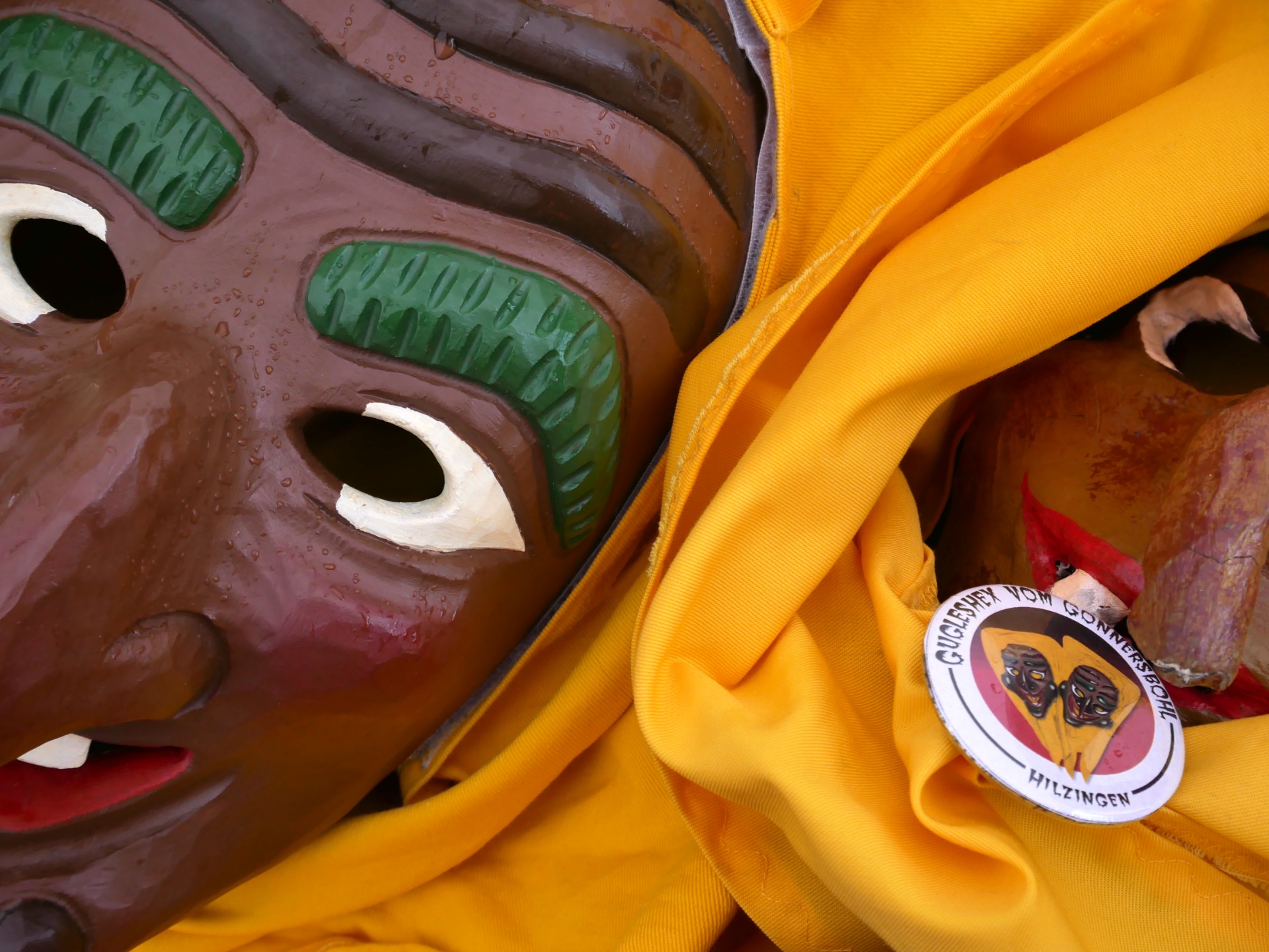 Komplett wird unser Outfit mit unserer handgemachten Masken. Manche unserer Hexen tragen eine von einem Holzschnitzer gefertigte Maske, andere haben sich ihre ganz eigene, selbst gemachte Version geschaffen, ganz nach Geschmack und Persönlichkeit. So bleibt jede Hexe einzigartig, doch gemeinsam ergeben wir ein harmonisches und lebensfrohes Bild in unseren Vereinsfarben.